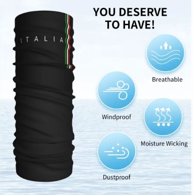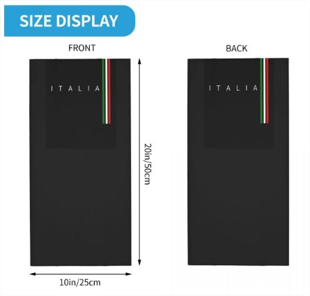 Tento víceúčelový tunelový šátek Italia je velmi skladný a praktický doplněk pro každého. Lze ho využít jako pokrývku hlavy, masku přes ústa a nos, šátek, členku, ozdobu do vlasů, ozdobu zápěstí a další.